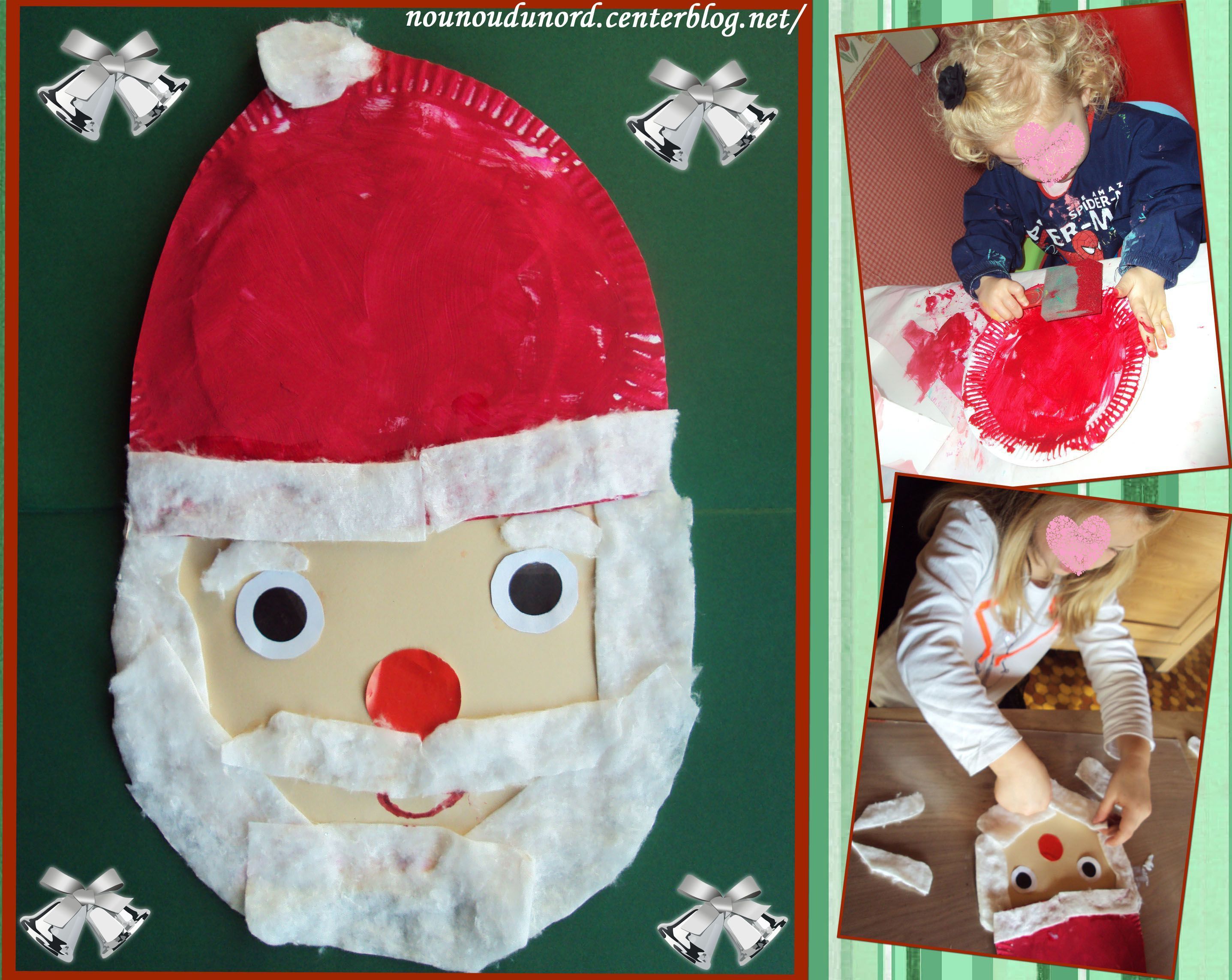 bravo les filles et a la nounou pour l idee.bises chrystelle du 76Tres jolie nous ce matin pere noel du meme genre mais avec deux asssiette en cartons et feutrine rouge pour le chapeau!!!C'est une très bonne idée. Le maître de mon fils n'est pas très manuelle. Il cherche des idées pour faire des déco pour la classe. Ton blog est génial, y'a pleins d'idées sympas à faire avec les loulous. Bonnecontinuation.trop beau ce pere Noel !! bravo !http://nounou82.centerblog.net