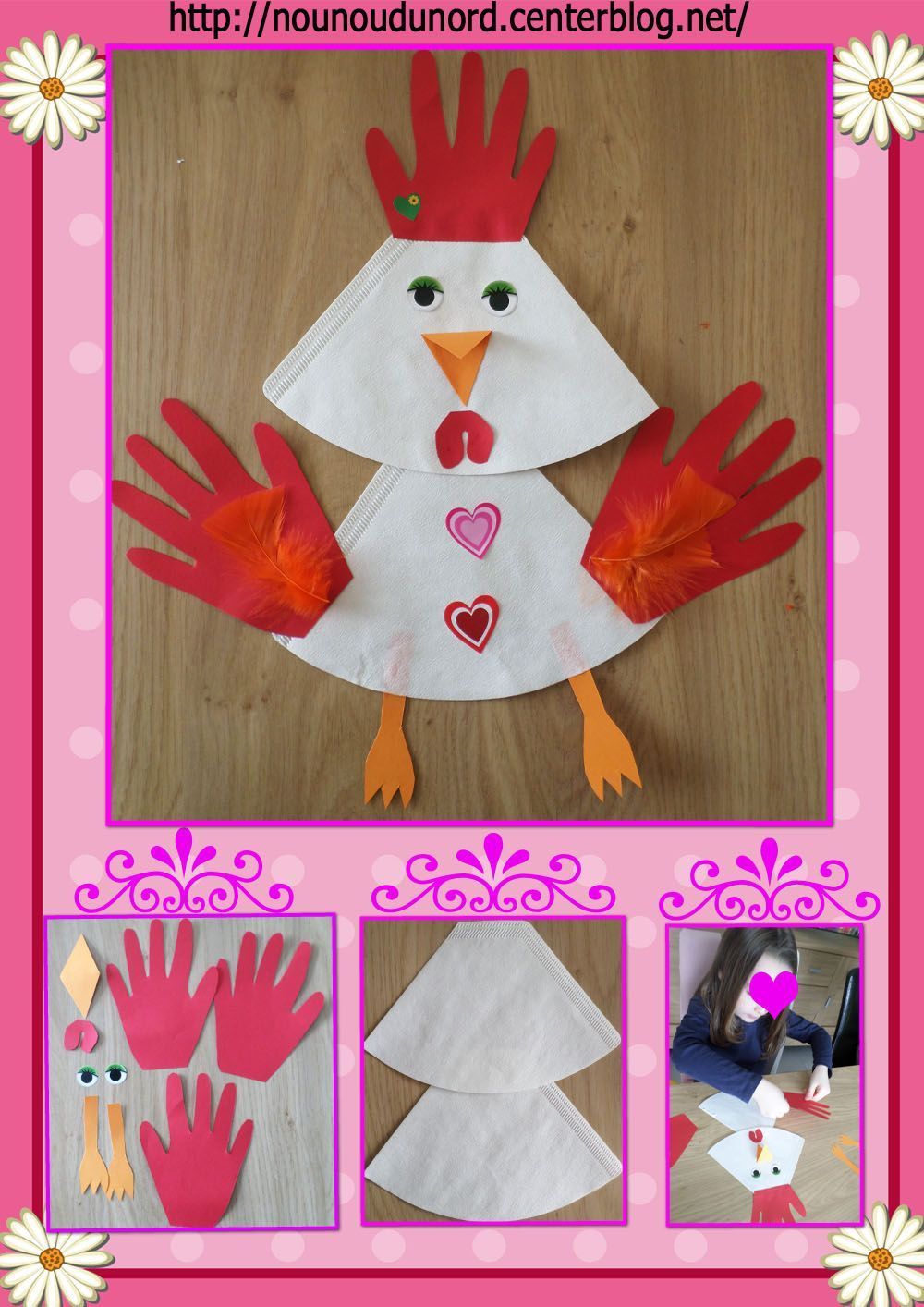 Poule de Pâques réalisé par Annalisa bientôt 4 ans avec des filtres à café et des feuilles de couleur une orange pour le bec et les pattes, une rouge pour les 3 empreintes de mains et les barbillons, des yeux en gommettes et des coeurs.