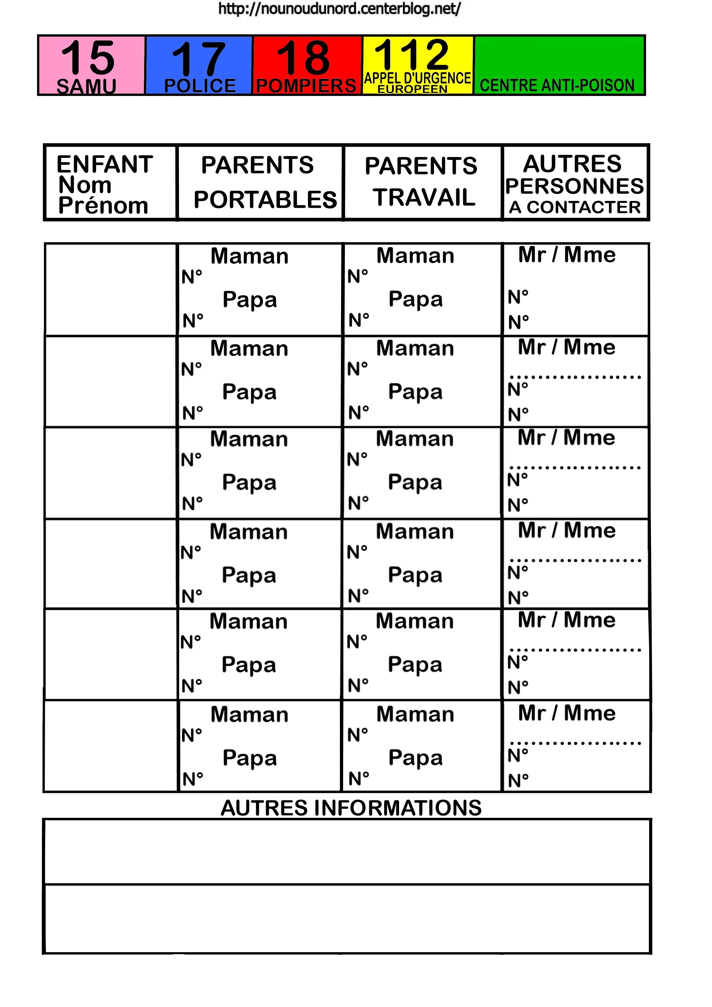 Fiches pour les assistantes maternelles avec les numéros de téléphones des urgences et des employeurs, sur la case centre antipoison vous ajouterez le n° de votre région.