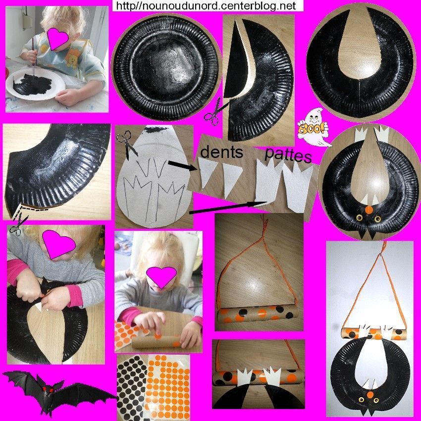 Peindre l'assiette en carton en noir, pliez la en 2 découpez la dans le centre comme sur la photo l'utilisez ce morceau pour y découper les dents et les pattes du côté non peint que vous fixez avec de la colle sur le corp, dans le bas de l'assiette qui est pliez en 2 découpez y la forme des oreilles et arondir un peu le bas pour faire la tête, ajoutez les yeux et le nez ensuite pour la suspendre utilisez un rouleau de récupération ici celui du papier allu, ajouter des gommettes pour le décorer ou le peindre passer une ficelle à l'interieur et y coller les pattes de la chauve-souris.