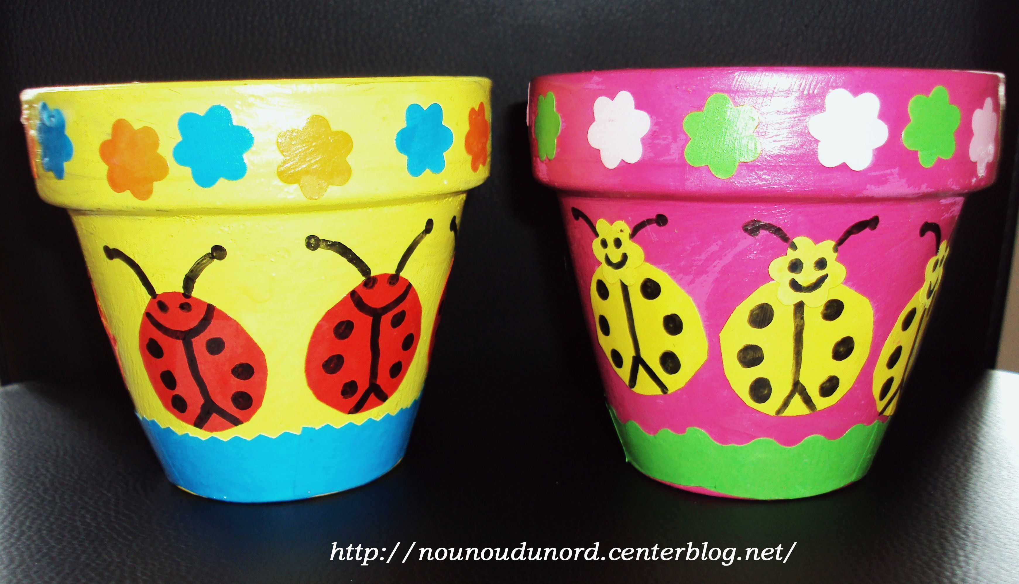 Peindre des pots de terre cuite avec de la peinture acrylique, coller y des gommettes et des coccinelles. ensuite nous avons recouvert de vernis colle mais au soleil il a fait des cloques donc je vous conseil plutôt mettre du vernis incolore celui pour les boiseries,