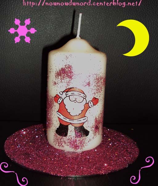 Sur la bougie coller au vernis colle des images de Noël trouvé sur le net, des stickers et saupoudrer de paillettes, sur les CD rose appliquer une belle couche de vernis colle et saupoudrer de paillettes, sur l'autre CD coller des étoiles ou autre..., une fois le tout sécher coller au pistolet à colle la bougie sur le support CD